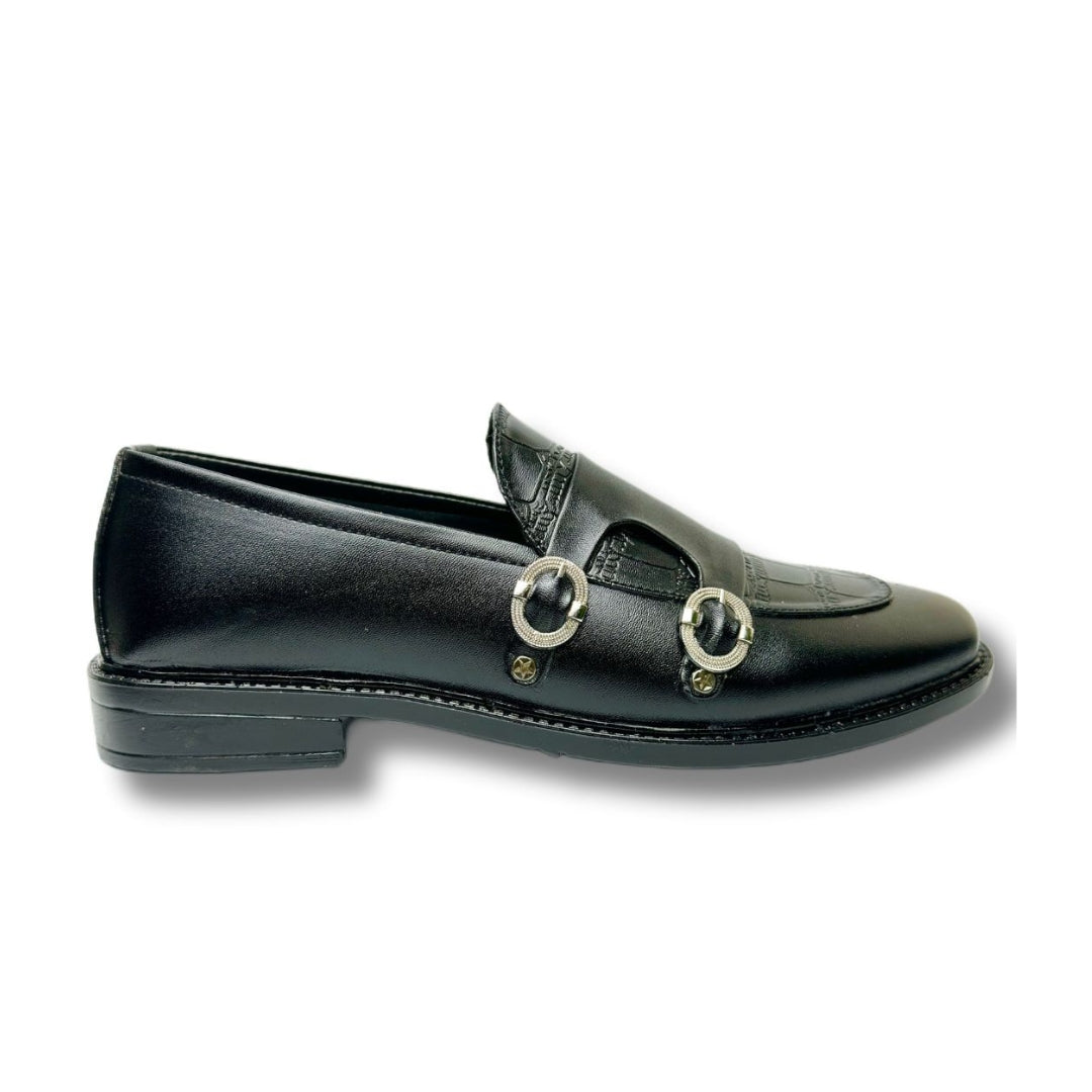 Upper: Premium genuine calf leather in a polished black finish with a sleek monk strap buckle detail.